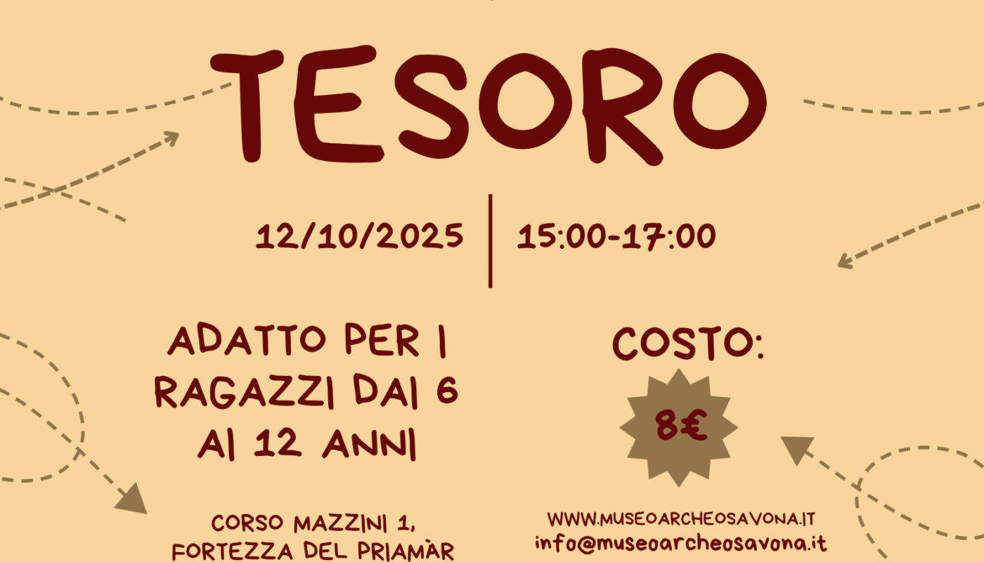 In occasione della giornata F@MU, venite a scoprire i segreti del Priamàr in questa entusiasmante caccia al tesoro che si snoda per tutta la fortezza! Una serie di indizi vi porteranno a spasso per il Priamàr facendovi scoprire il volto nascosto della fortezza fino ad arrivare alla tappa finale dove per ogni partecipante è prevista una piccola sorpresa. Adatto per i ragazzi dai 6 ai 12 anni. Per prenotare basterà inviare una mail a info@museoarcheosavona.it oppure telefonare in Museo al 019-2211770.