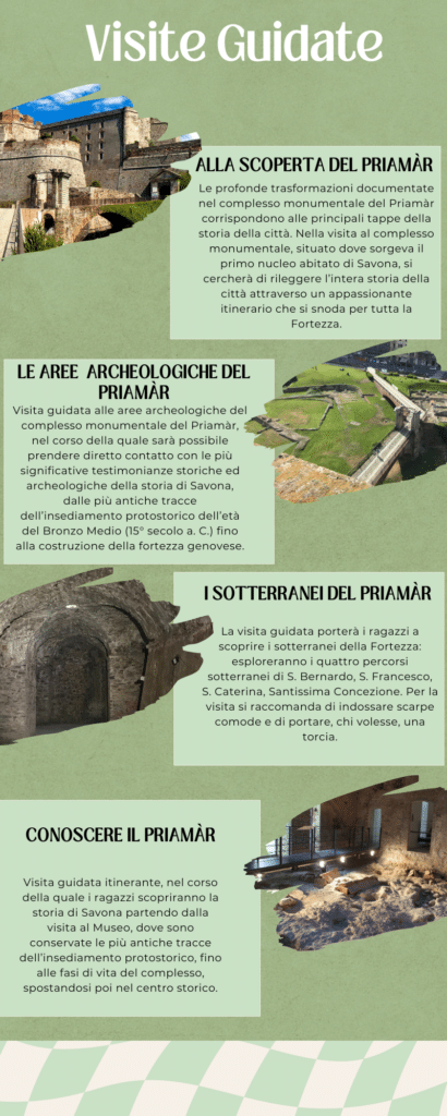The workshops, guided tours and thematic routes take place at the Civic Archaeological and City Museum of Savona and in the spaces of the Priamàr Fortress. It will also be possible, on request, to dedicate an hour of the day to carrying out holiday homework. Inclusive and accessible routes or projects are planned. For more information on educational workshops, please consult the educational section above!