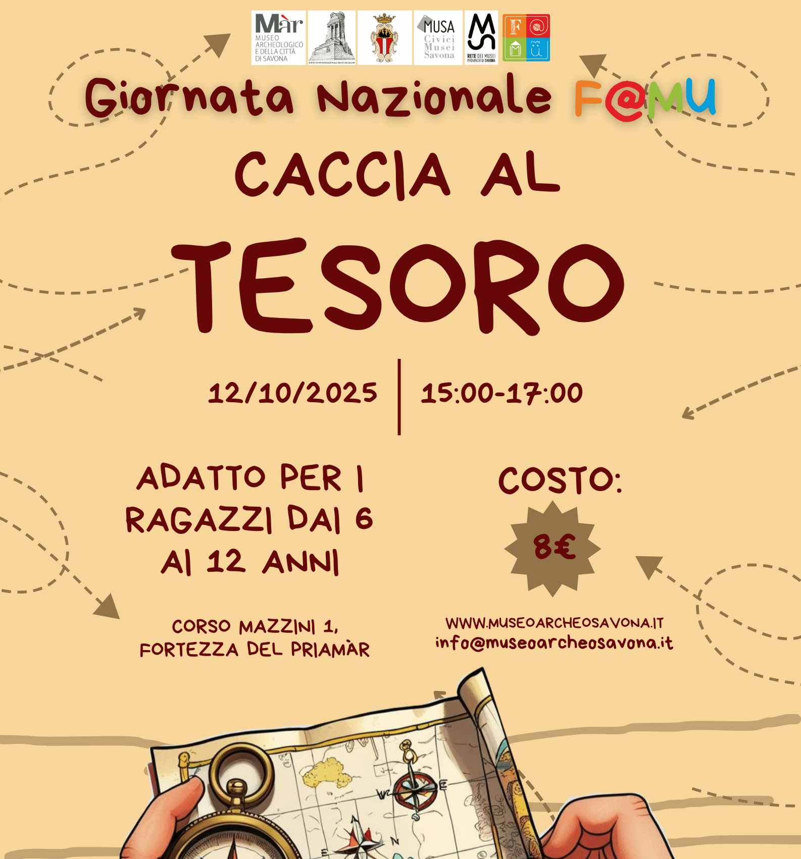 In occasione della giornata F@MU, venite a scoprire i segreti del Priamàr in questa entusiasmante caccia al tesoro che si snoda per tutta la fortezza! Una serie di indizi vi porteranno a spasso per il Priamàr facendovi scoprire il volto nascosto della fortezza fino ad arrivare alla tappa finale dove per ogni partecipante è prevista una piccola sorpresa. Adatto per i ragazzi dai 6 ai 12 anni. Per prenotare basterà inviare una mail a info@museoarcheosavona.it oppure telefonare in Museo al 019-2211770.