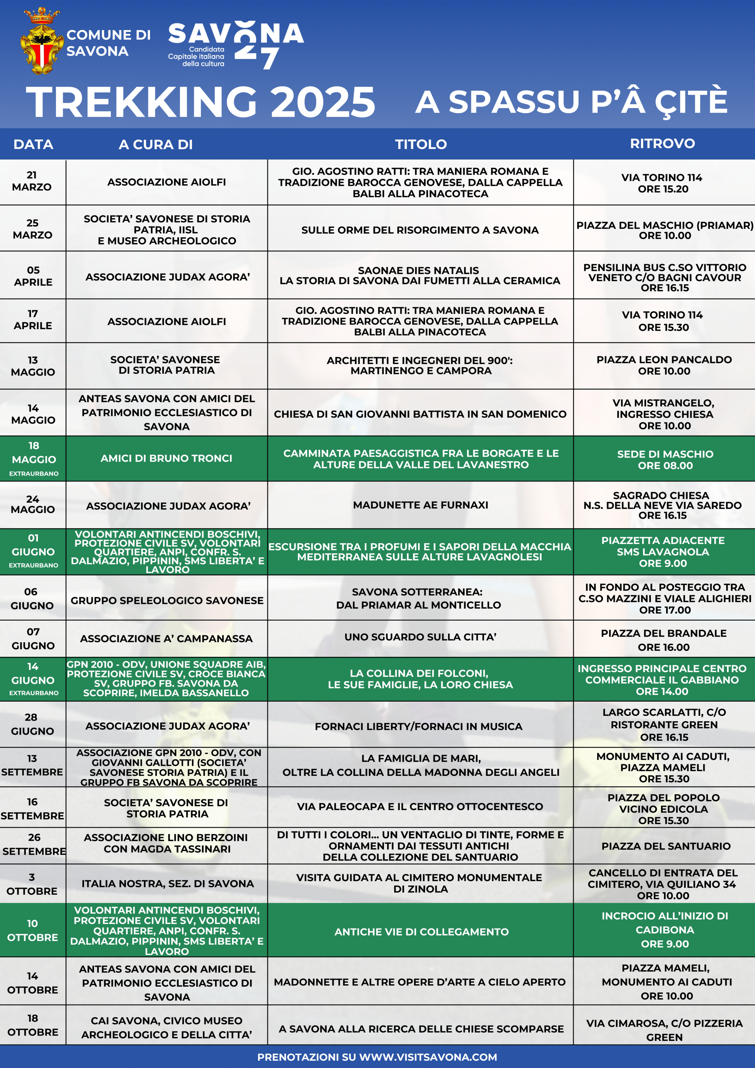 Le camminate cittadine “A Spassu p’a çitè” ripartono verso nuove destinazioni e il Comune di Savona, grazie al supporto di Associazioni ed Enti del territorio, è pronto a proporre un programma ricco e variegato anche per il 2025 con 21 proposte di trekking Urbani ed Extraurbani. Da una parte, quindi, sarà esplorato il centro cittadino con approfondimenti sugli aspetti culturali, artistici, architettonici e storici e, dall’altra, si potranno riscoprire sentieri, antiche strade e collegamenti sulle alture cittadine. Le esperienze offrono racconti e spiegazioni di accompagnatori esperti ed appassionati. Per prendere parte ai trekking è necessario registrarsi sul sito Visit Savona , in particolare, nella sezione “eventi” verranno pubblicati i box con le istruzioni per prendere parte allo specifico trekking, il dettaglio del percorso ed eventuali altre informazioni per prepararsi al meglio all’esperienza.